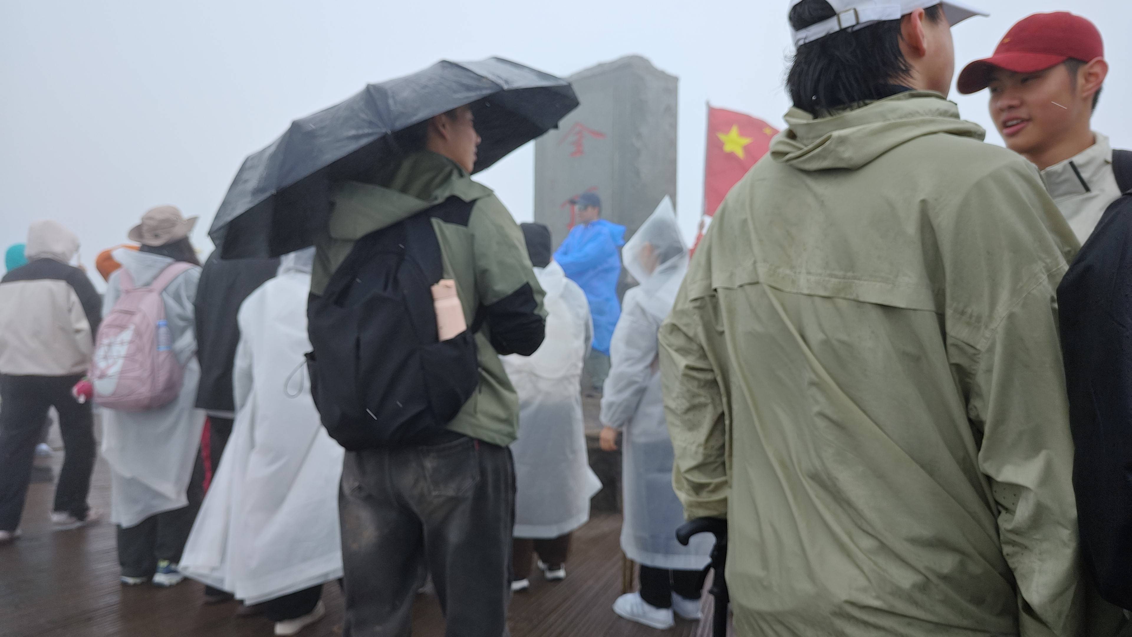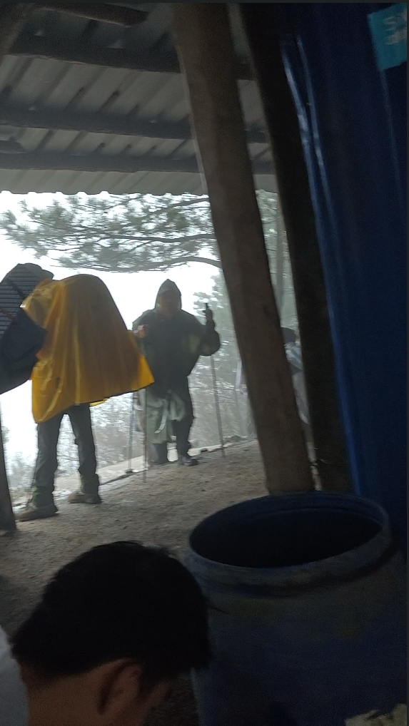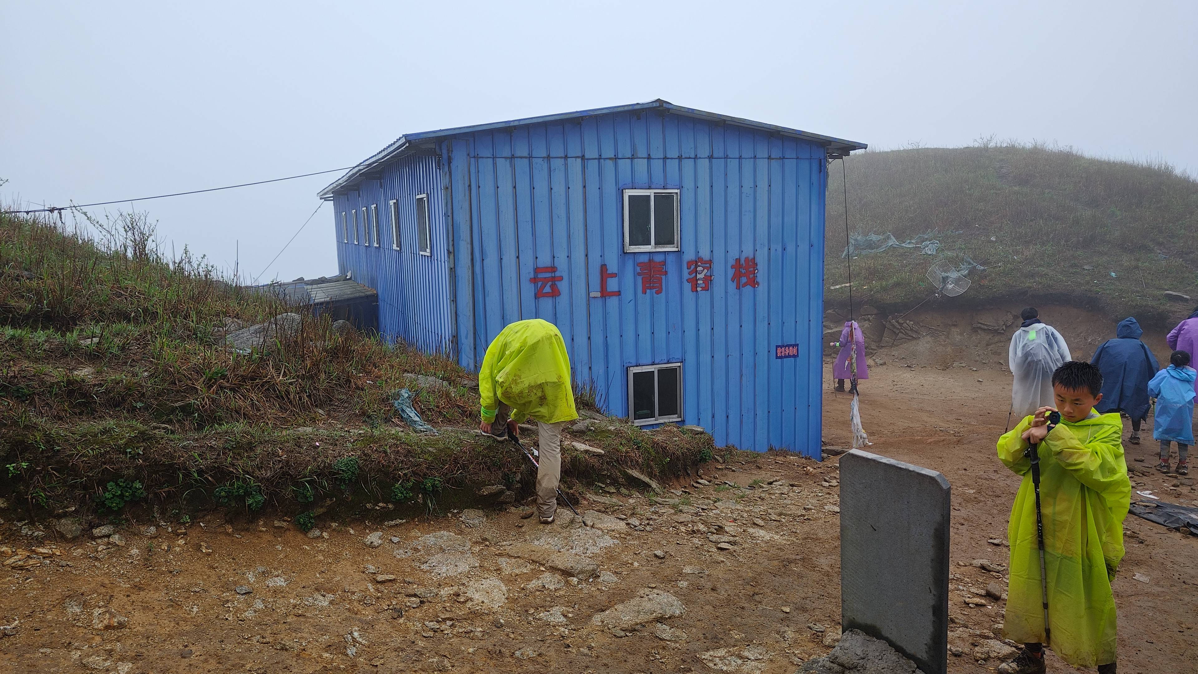 又向上走不就开始下雨了 大伙纷纷到铁皮棚子换上雨衣