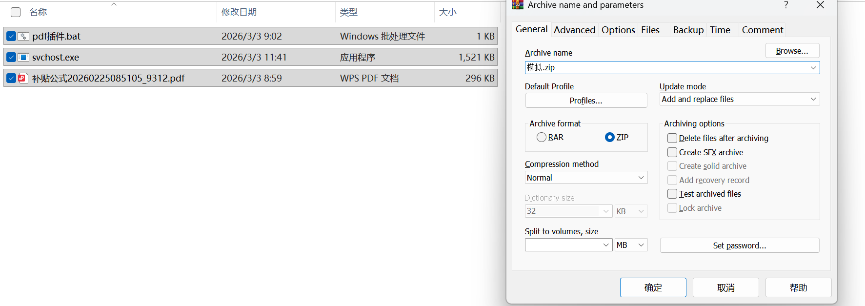 选中三个文件(木马 名字.exe、启动脚本 bat、伪装 pdf),右键选择 “添加到压缩文件”。