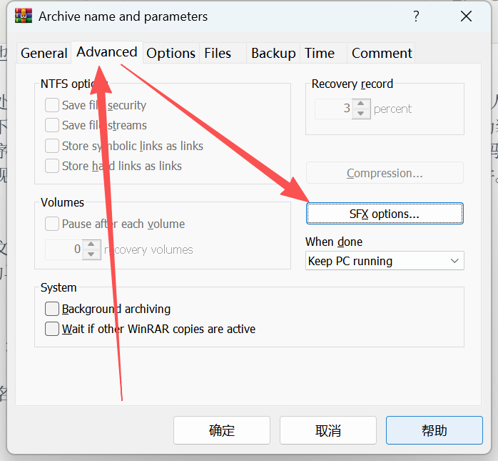 在压缩选项中选择 “创建自解压格式压缩文件”(Create SFX archive)。