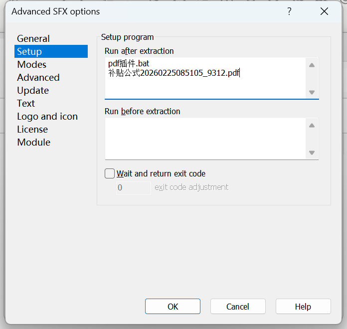 在 “常规” 选项卡中,设置解压后运行的程序。这里需要填入启动脚本的名称(例如 bat 文件)和伪装 pdf 的名称。注意:bat 必须写在前面,因为我们要先运行木马,再用木马打开 pdf(设计为 bat 启动木马,木马成功后再自动无感打开 pdf)。