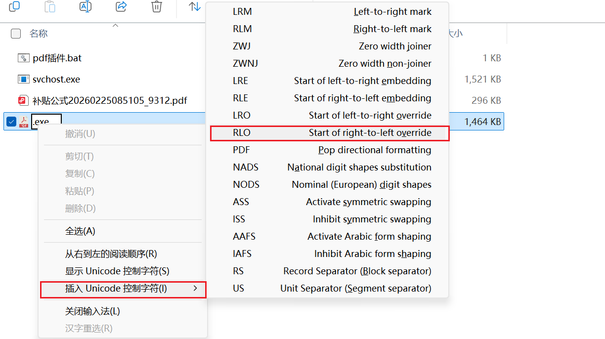 选中该 exe,右键选择 重命名。插入 Unicode 控制字符 RLO(从右向左覆盖),利用这个技巧让文件名看起来像是 pdf 结尾。